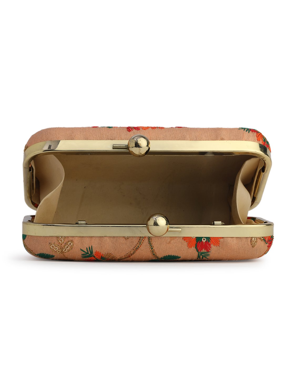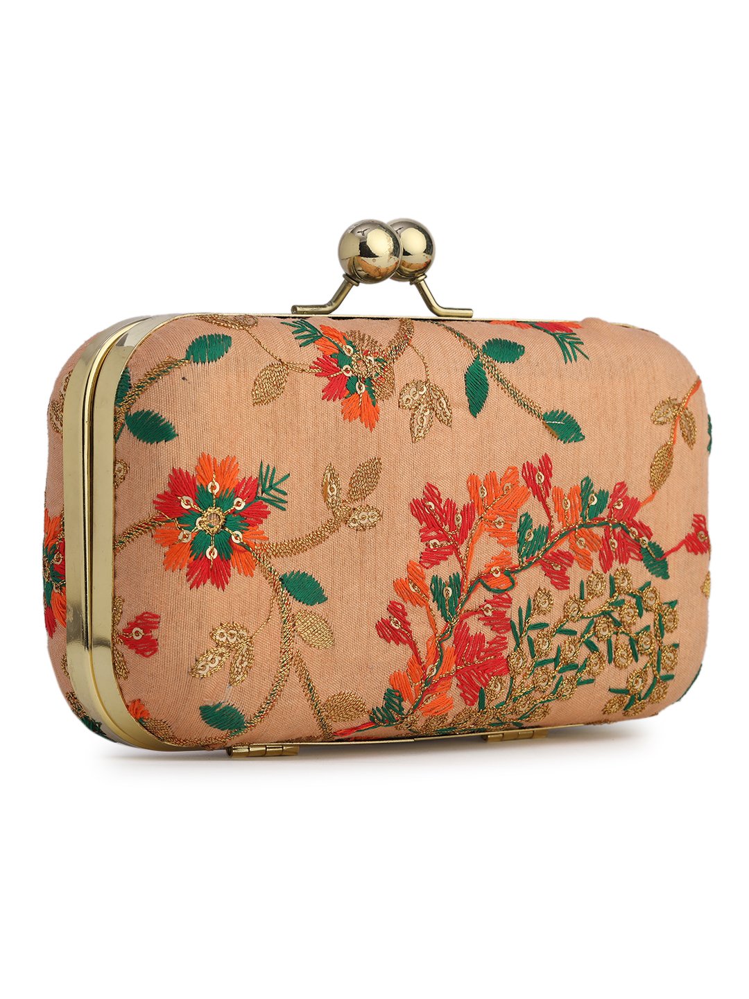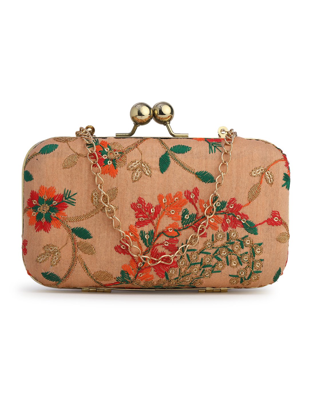 Peach & Green Embroidered Box clutches, Has gold chain shoulder strap, 1 main compartment with twist closure