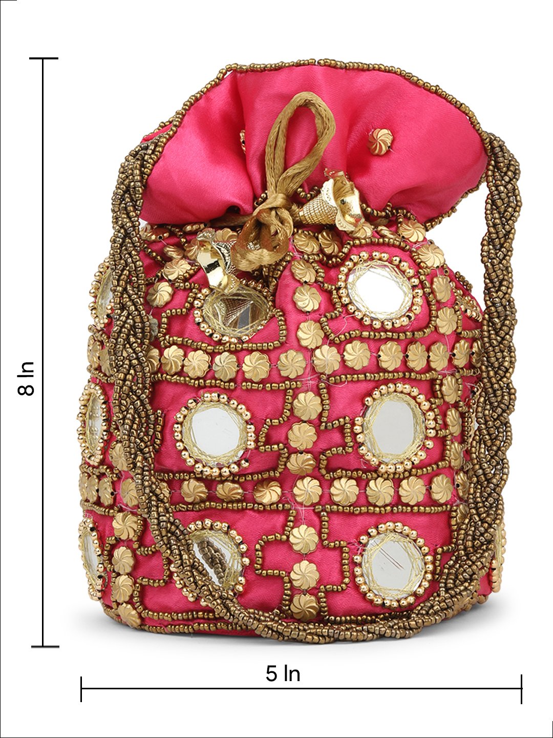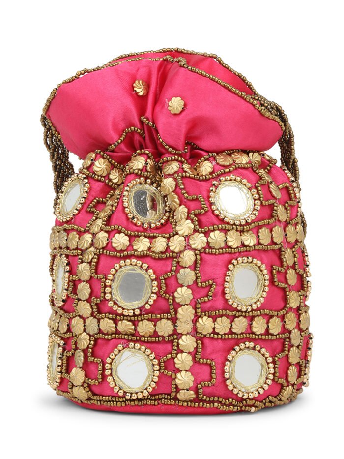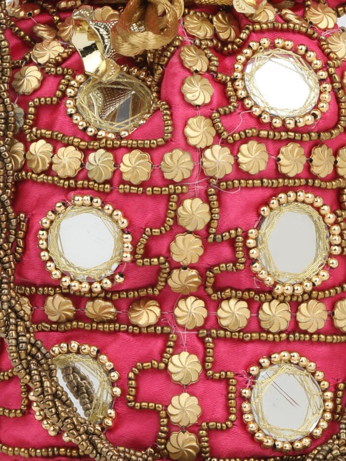 Red and gold-toned embroidered potli clutches Has wrist loop 1 main compartment with drawstring closure Size & Fit Height: Width: Depth: Material & Care Wipe with clean, dry cloth