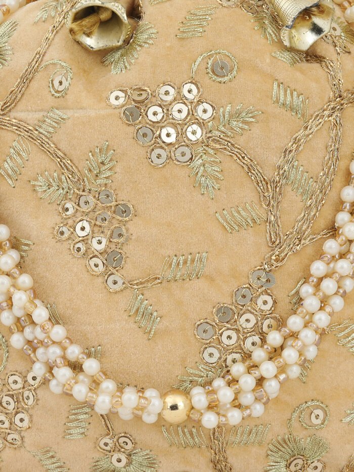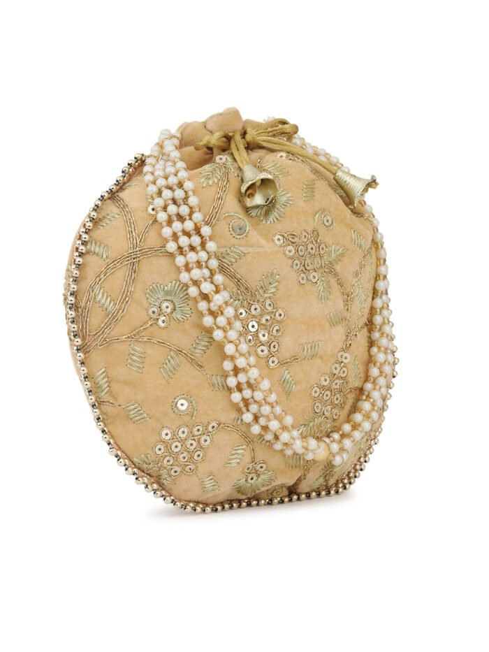 Beige and white embellished potli clutches Has wrist loop 1 main compartment with drawstring closure Size & Fit Height: 22 cm Width: 22 cm Depth: 7.62 cm Material & Care Fabric Wipe with clean, dry cloth