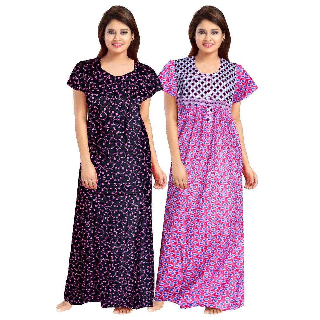 PACK of 2 Nighties; Age Range Description: Adult Sleeve Length: Short Sleeves; Pattern: Printed; Fit Type: Regular; Fabric: Cotton 100% soft cotton fabric for ultimate comfort; It will make you feel pretty and pampered all at the same time Size: Nighty comes in free size and completely adjustable for (Length-55,Waist-40,Bust-44) Length : Full Length Wash Care: This nighty can be hand washed or normal machine washed with cold water. Please make sure to dry the nighty in a light shade away from direct sunlight.
